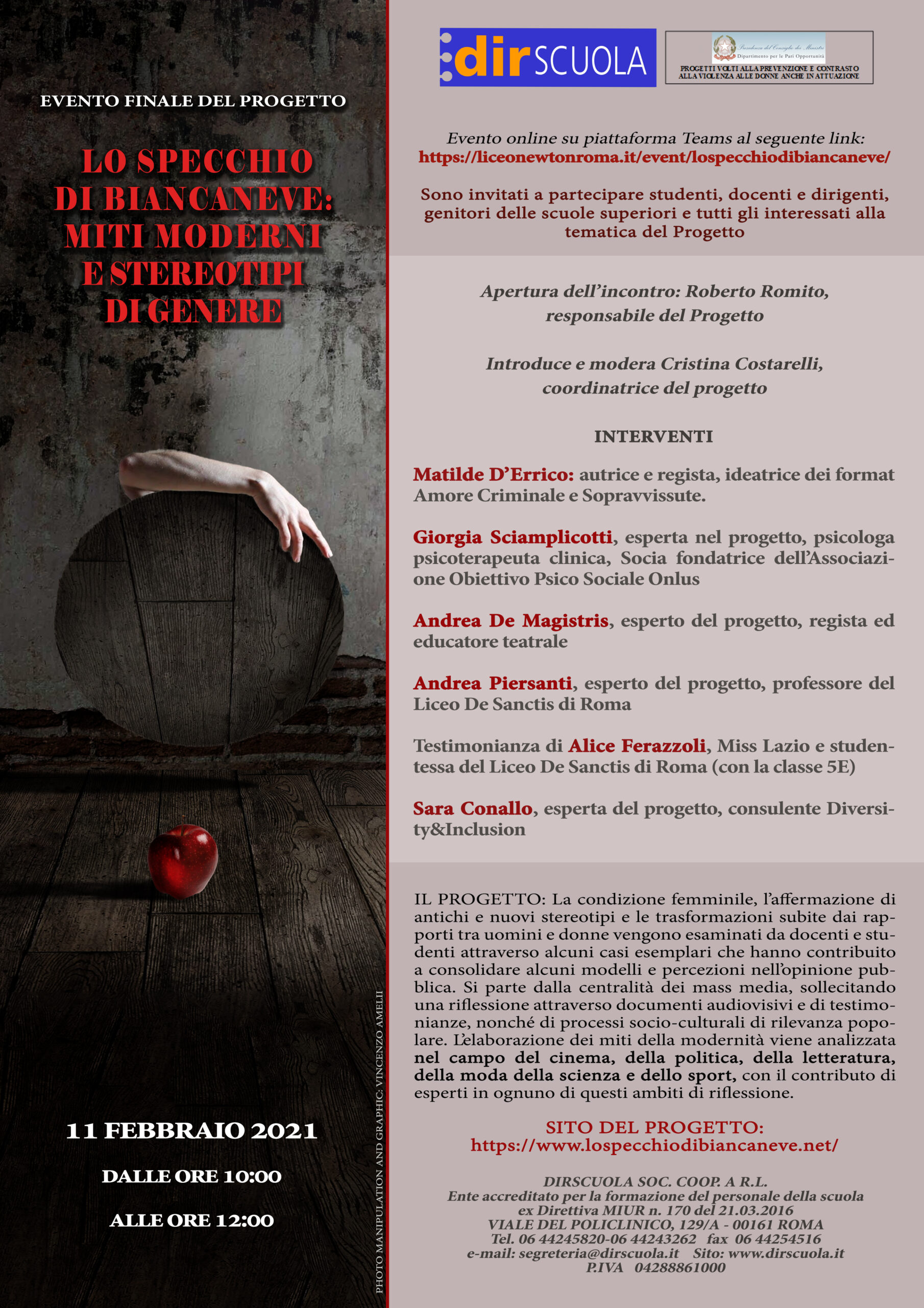 Evento LIVE finale del progetto sulla Parità di Genere Partecipa all'evento live dell' 11 febbraio 2021Lo specchio di biancaneve Rivedi l'evento LIVE del 4 febbraio 2021Lo specchio di biancaneve